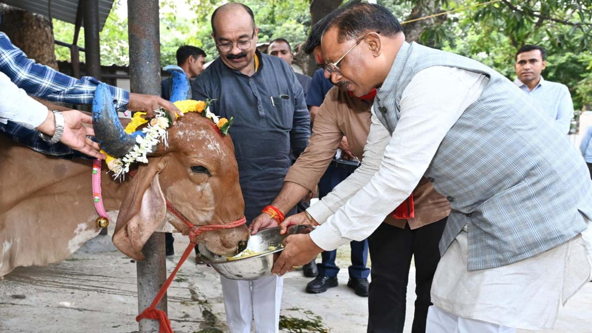 गोवर्धन पूजा : मुख्यमंत्री विष्णुदेव साय ने सीएम हाउस में की गौवंश की पूजा, गाय को गुड़ और खिचड़ी खिलाई