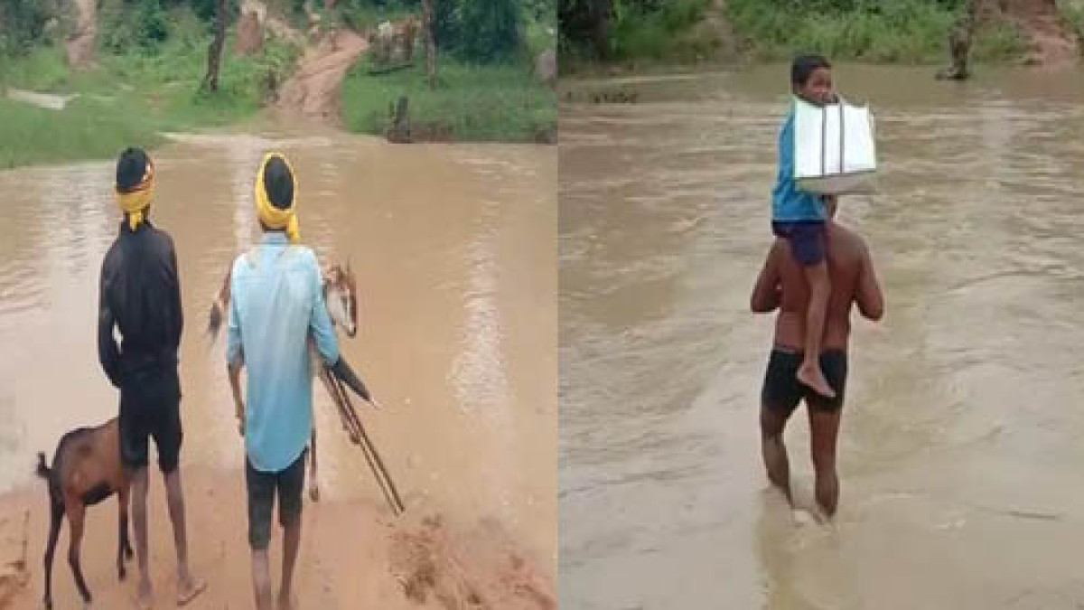 अच्छी बारिश से किसानों में तो खुशी की लहर बनी हुई है। वहीं दूसरी तरफ कुछ वनांचल गांव में स्थिति यह ठीक नहीं है। राशन दुकान आने या स्कूलों तक पहुंचने के लिए उफनती नदी-नालों को पार करना पड़ रहा है। इन तस्वीरों में देखा जा सकता है कि, लोग स्कूली बच्चों को अपनी पीठ पर लादकर और जान जोखिम में डालकर पार करवा रहे हैं। इन आश्रित गांवों की मांग है कि, नदी-नालों को पार करने के लिए व्यवस्था की जानी चाहिए।