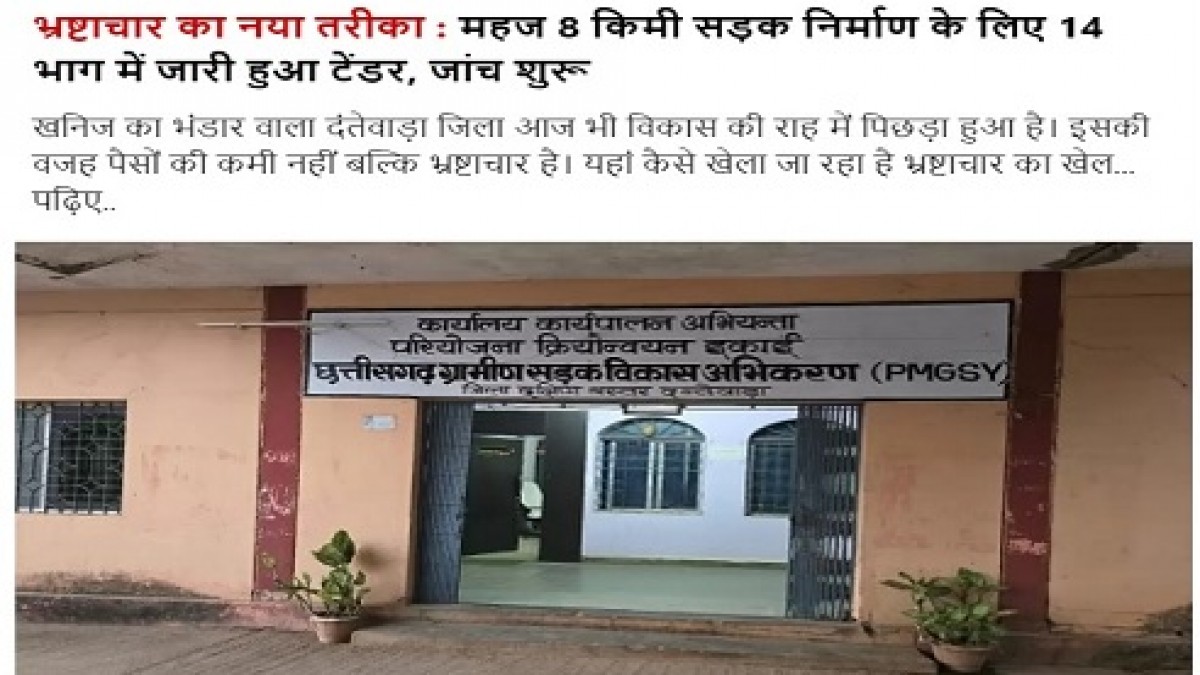 पंकज भदौरिया- दंतेवाड़ा। दंतेवाड़ा जिले के अलग-अलग इलाक़ों में बन रही चार सड़कों का कार्य कलेक्टर मयंक चतुर्वेदी ने निरस्त कर दिया है। चारों सड़कों की निविदा प्रक्रिया में बड़ी गड़बड़ी को लेकर हरिभूमि डाट कॉम ने बुधवार को प्रमुखता से खबर प्रकाशित की थी। जिसके बाद कलेक्टर ने चारों कार्य निरस्त कर दिए हैं। जिन कार्यों को निरस्त किया गया उनमें मोखपाल से छोटेगुडरा, महाराकरका से छोटे हड़मामुंडा तक, पोन्दुम मुख्य मार्ग से पटेलपारा होते हुए बटुमपारा एवं गीदम बीजापुर मार्ग से फरसमुदुर तक के कार्य में निविदा प्रक्रिया का विधिवत पालन नहीं किया गया था। इन चारों सड़कों की लागत तीस करोड़ से ज्यादा की थी।