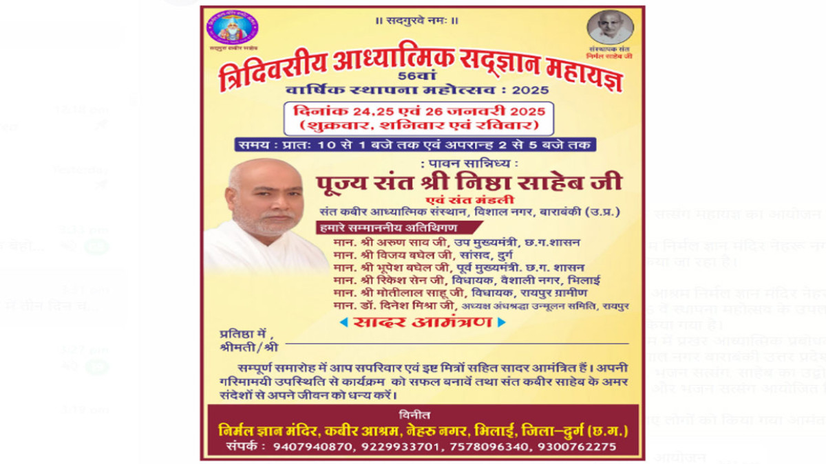 कबीर आश्रम निर्मल ज्ञान मंदिर नेहरू नगर भिलाई में तीन दिवसीय आध्यात्मिक सत्संग महायज्ञ का आयोजन किया जा रहा है।