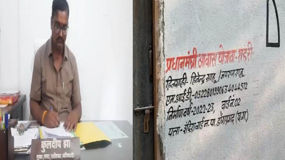 राजा शर्मा/डोंगरगढ़- केंद्र सरकार की महत्वकांक्षी योजना पीएम आवास योजना के तहत गरीबों को लाभ मिल रहा है। लेकिन इस योजना के नाम पर छत्तीसगढ़ के डोंगरगढ़ में लगातार फर्जीवाड़ा का मामला सामने आया है। जिसको लेकर कुछ दिन पहले दुर्ग के ज्वाइंट डायरेक्टर यहां पर पहुंचे थे और फर्जीवाड़े के खिलाफ कार्रवाई करने के बात कही थी। इसके बावजूद अधिकारी किसी भी तरह का एक्शन नहीं ले रहे हैं। ताजा मामला नगर पालिका डोंगरगढ़ के वार्ड नंबर 08 का है। जहां बने आवास को देखकर और उस पर लिखे जानकारी को पढ़ कर सबके होश उड़ गए।