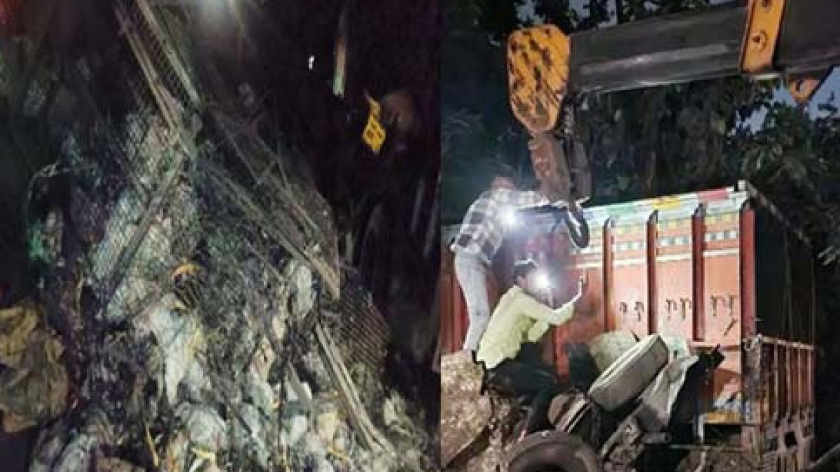 ट्रक और मुर्गियों से भरी पिकअप में भिड़ंत : दो की मौत, क्रेन की मदद से शवों को निकाला बाहर