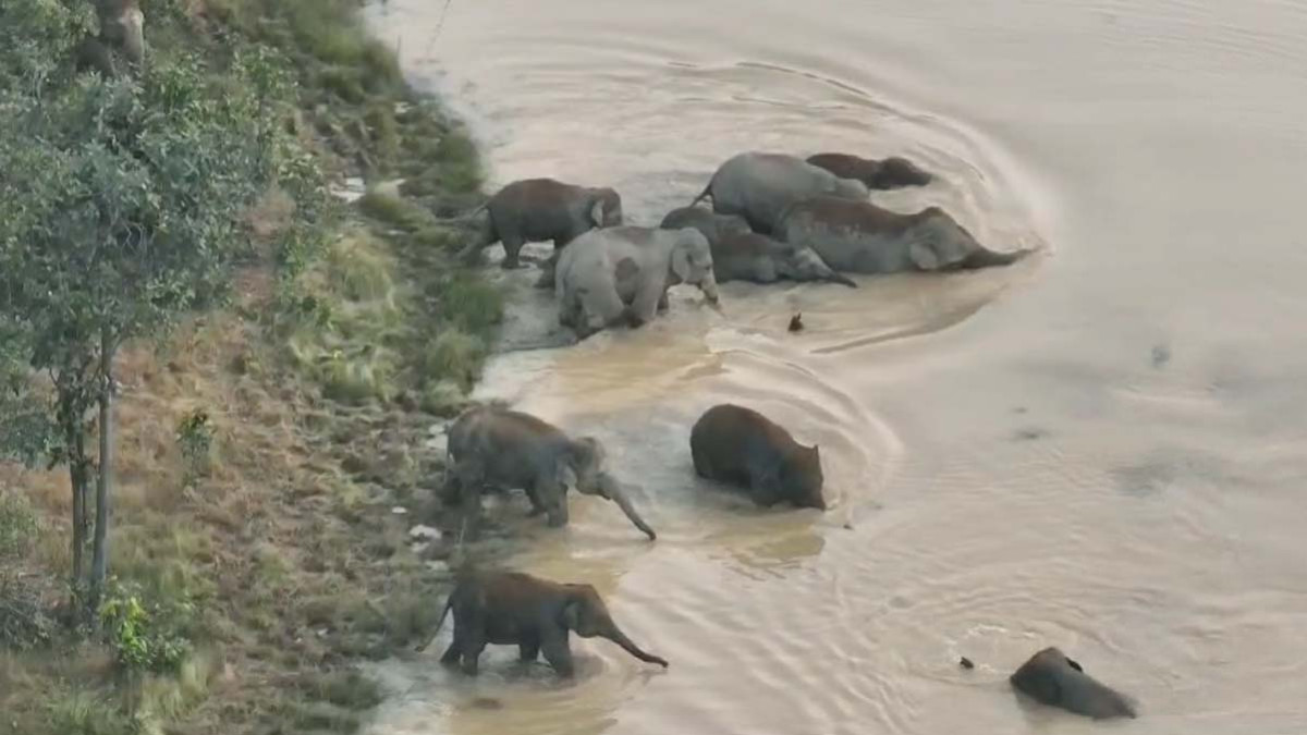 पानी में हाथियों की मस्ती : घने जंगलों के बीच बांध में नहाते ड्रोन कैमरे में कैद हुआ 29 हाथियों का दल