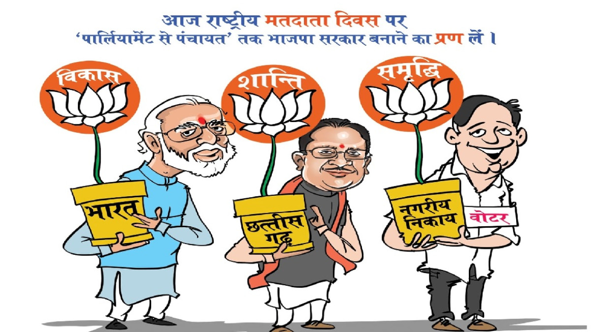 रायपुर। राष्ट्रीय मतदाता दिवस पर छत्तीसगढ़ में बीजेपी का पोस्टर वार शुरू हो गया है। बीजेपी ने पोस्टर जारी कर पीएम मोदी, सीएम विष्णु देव साय और वोटर की तस्वीर शेयर लिखा है कि, मतदाता का विश्वास भाजपा के साथ। पार्लियामेंट से पंचायत तक भाजपा सरकार बनाने का प्राण लें।
