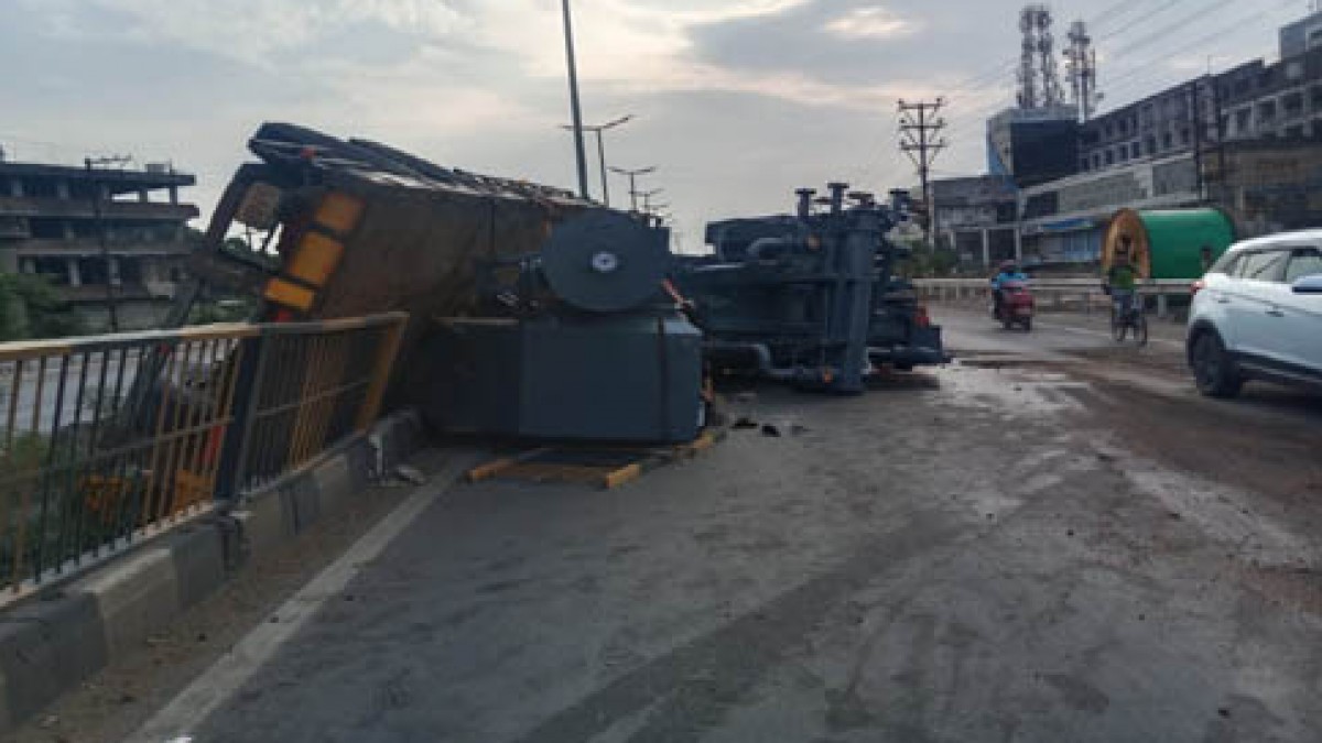 ट्रेलर डिवाडर से जा टकराया : हादसे में ड्राइवर को आई गंभीर चोट, ट्रांसफार्मर लेकर पुणे से कोलकाता जा रहा था