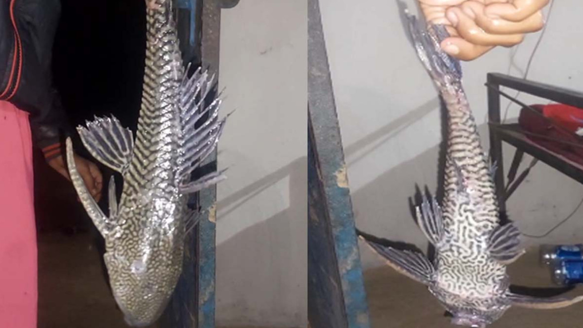 जशपुर में एक मछुआरे के जाल में अमेरिका की अमेजन नदी में पाई जाने वाली सकरमाउथ कैट फिश फंसी है।