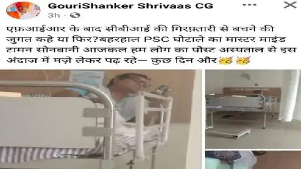 रायपुर। छत्तीसगढ़ में सीजीपीएससी के पूर्व चेयरमैन टामन सिंह सोनवानी की तबीयत ख़राब हो गई है और वे एक निजी अस्पताल में भर्ती हैं। उनकी फोटो को भाजपा प्रवक्ता गौरीशंकर श्रीवास ने सोशल मीडिया पर तस्वीरें शेयर कर कटाक्ष किया है। बीजेपी प्रवक्ता गौरीशंकर श्रीवास ने अपने अकॉउंट X लिखा कि "FIR के बाद इसे CBI की गिरफ्तारी से बचने की जुगत कहे या फिर ? बहरहाल PSC घोटाले का मास्टर माइंड टामन सोनवानी आजकल हम लोगों के पोस्ट अस्पताल से इस अंदाज में मजे लेकर पढ़ रहे- कुछ दिन और"।
