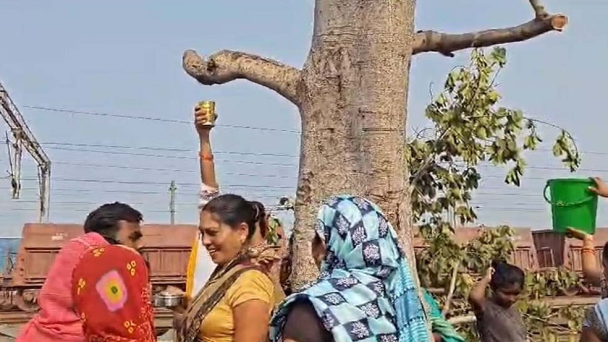 बरगद के पेड़ से निकल रहा पानी : लोग बर्तनों में भरकर ले जा रहे घर, देखने के लिए लोगों की उमड़ी भीड़
