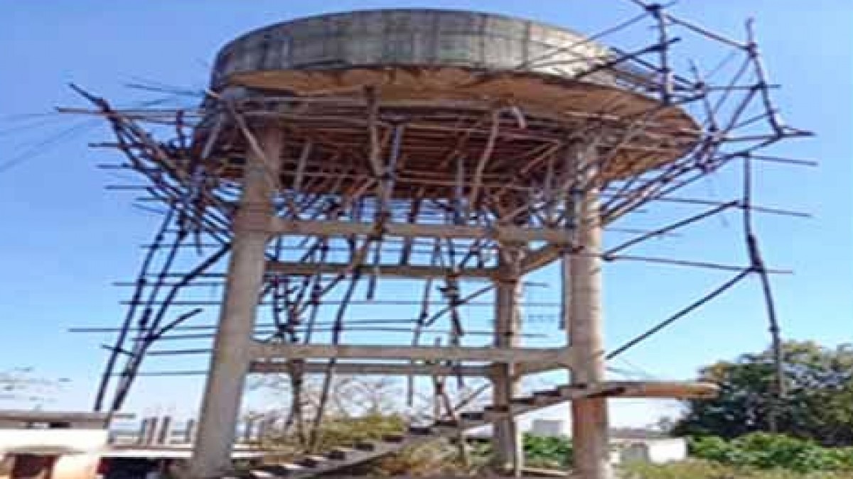 निर्माणाधीन टंकी में बाँस और सेंट्रिंग प्लेट लटका हुआ