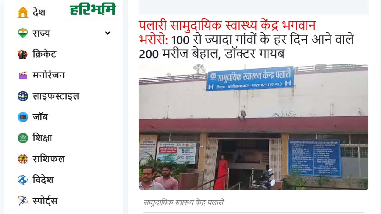 यह कार्रवाई हरिभूमि डॉट कॉम द्वारा 1 अगस्त को प्रकाशित की गई विशेष रिपोर्ट के 24 घंटे के भीतर की गई है, जिसमें CHC पलारी में व्यवस्थाओं की बदहाली और डॉक्टर की अनुपस्थिति को प्रमुखता से उजागर किया गया था।