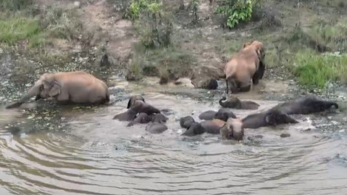 हाथियों का एक झुंड तालाब में नहाता दिख रहा है। झुंड में से एक बड़ा हाथी सिर नीचे और पैर ऊपर करके नहाता दिख रहा है। वहीं दूसरे वीडियो में एक हाथी का बच्चा पानी की टंकी के पास पहुंचा और सूंढ़ से पानी पीने के साथ खुद को ठंडा करता नजर आता है। फिलहाल पर्यटकों की भीड़ से जानवरों को बचाने के लिए बरमकेला क्षेत्र को आम लोगों के लिए बंद किया गया है।