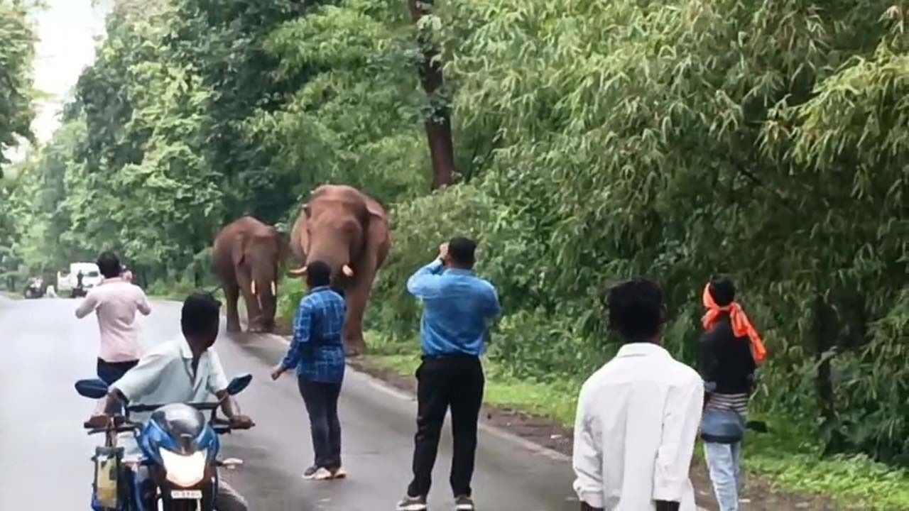 सड़क पर दिखे दो दंतैल हाथी: राहगीरों ने अपनी-अपनी गाड़ी रोककर बनाया VIDEO