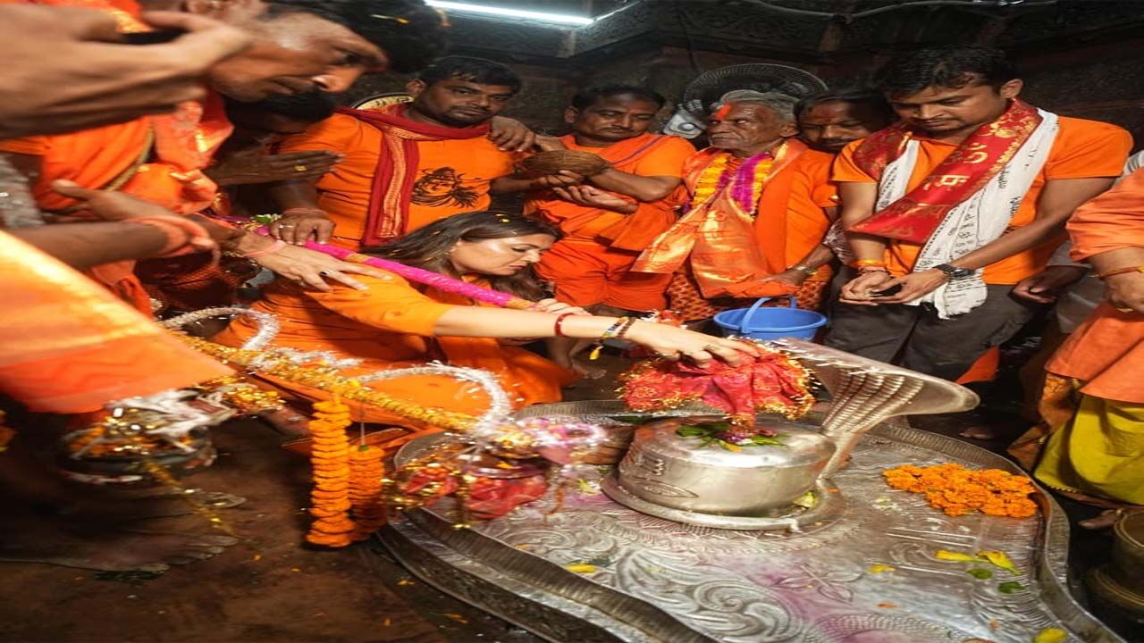 मंदिर में भक्त जलाभिषेक कर बेल पत्र और पुष्प अर्पित कर रहे