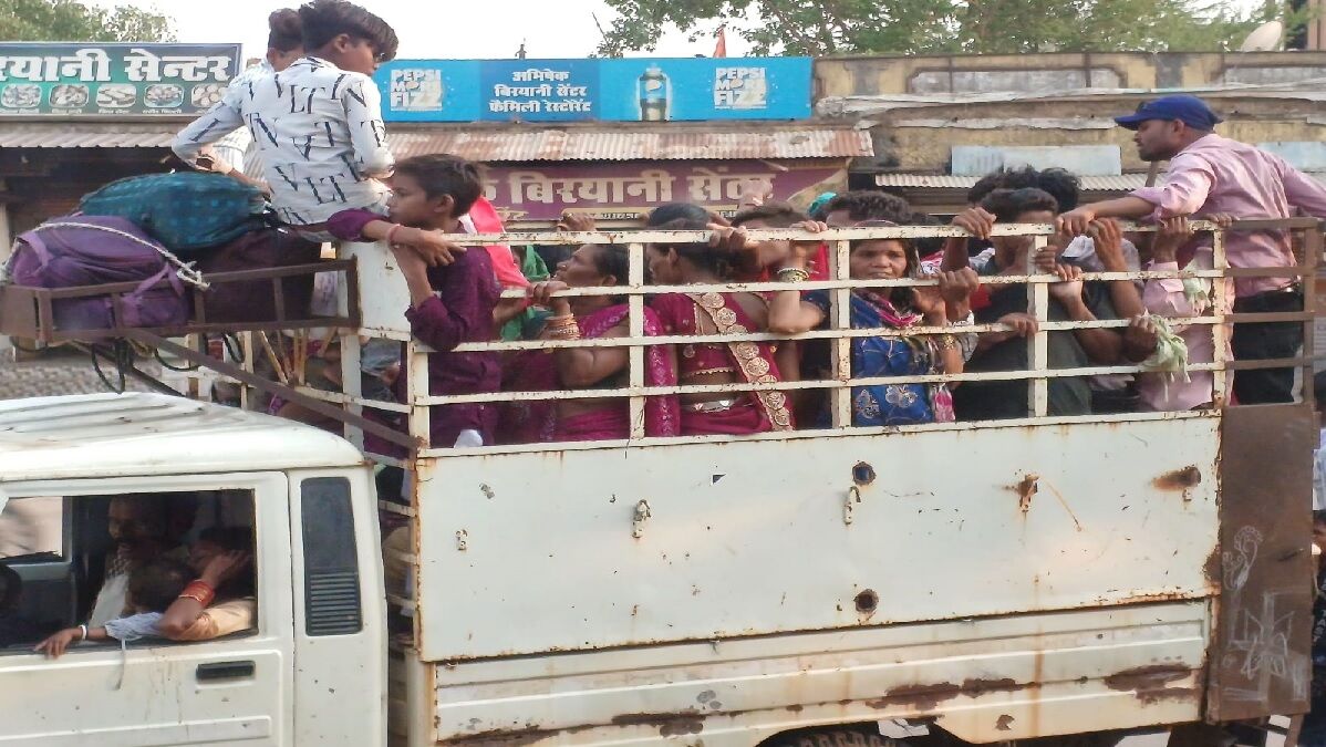मालवाहक में बैठकर सवारी करते हुए लोग