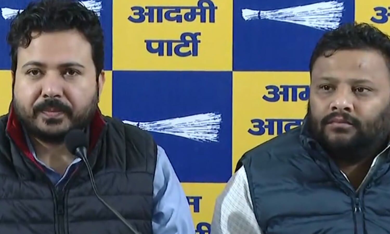 आप नेता दुर्गेश पाठक और विधायक कुलदीप कुमार प्रेसवार्ता को संबोधित करते हुए।