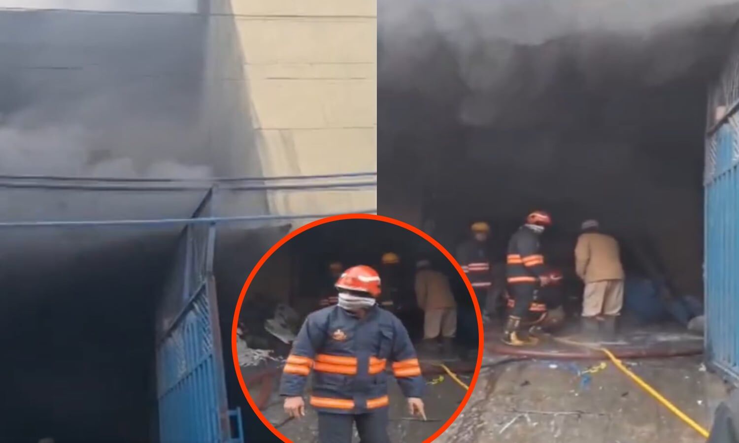 नरेला इंडस्ट्रियल एरिया की प्लास्टिक फैक्ट्री में लगी आग को बुझाते दमकल कर्मचारी।