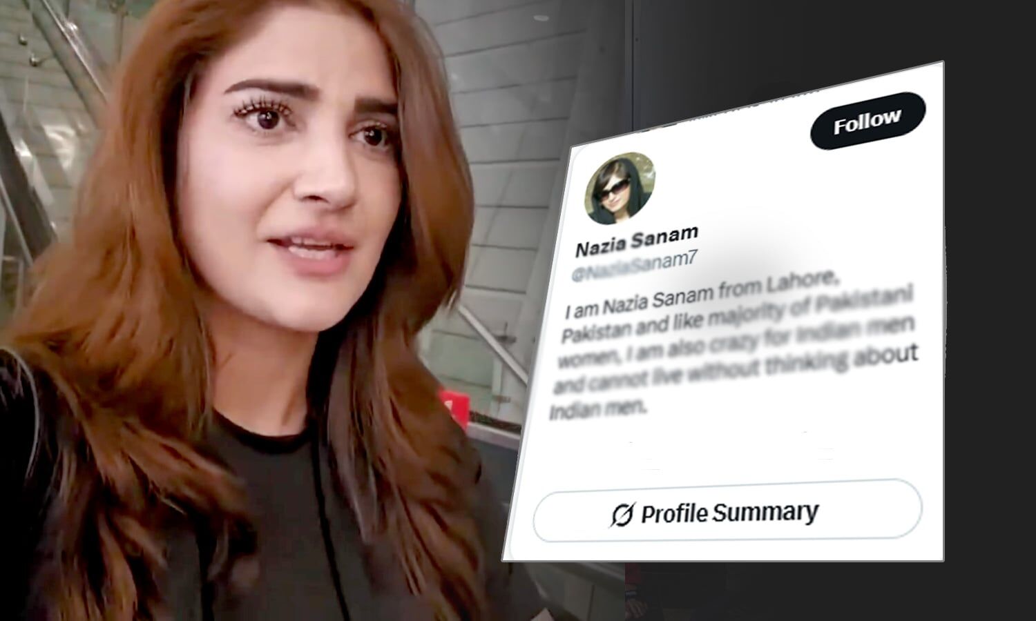 हमने जब नाजिया सनम के प्रोफाइल देखा तो इंफो में लिखा था, 'मैं नाजिया सनम, लाहौर, पाकिस्तान से हूं और अधिकांश पाकिस्तानी महिलाओं की तरह मैं भी भारतीय पुरुषों के लिए दीवानी हूं और भारतीय पुरुषों के बारे में सोचे बिना नहीं रह सकती। उनकी यह बायो बताता है कि वे भी भारतीय पुरुषों के लिए दीवानी हैं। लेकिन, अब जिस तरह से वीडियो अपलोड किया है, उसमें यह बताने का प्रयास किया है कि भारतीय पुरुष भी खूबसूरत पाकिस्तानी महिलाओं के लिए कुछ भी कर सकते हैं। यही नहीं, उन्होंने इस वीडियो के कैप्शन में भारत और पाकिस्तान के राष्ट्रीय ध्वज की फोटो के बीच दिल की इमोजी भी लगाई है।