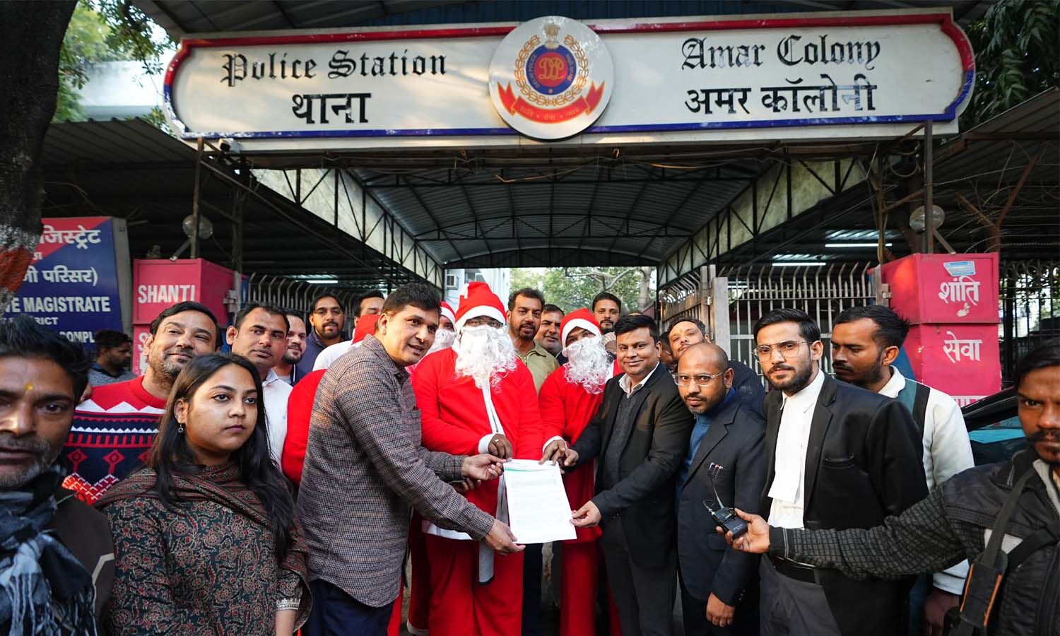 अमर कॉलोनी पुलिस स्टेशन के बाहर सौरभ भारद्वाज और 'सांता क्लॉज' को देखकर पुलिसकर्मी हैरान रह गए। दोनों ने मिलकर पुलिस को शिकायत दी। जानिये क्या है शिकायत...