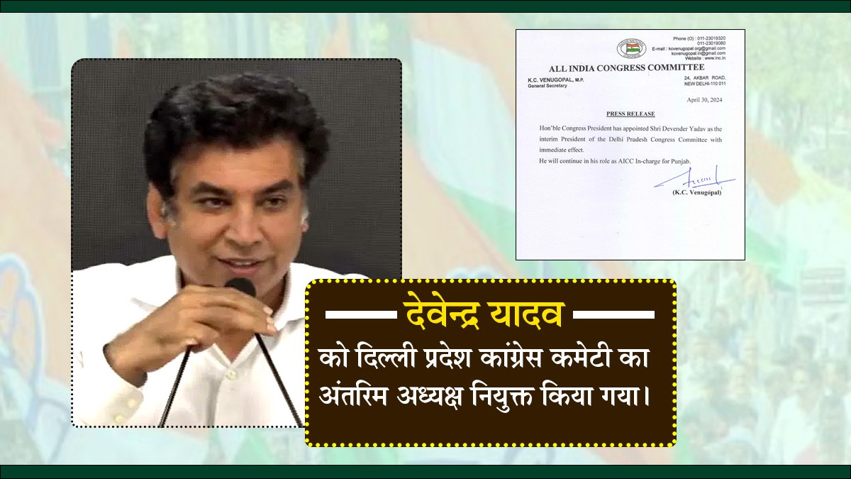 दिल्ली में कांग्रेस के पूर्व विधायक देवेंद्र यादव को तत्काल प्रभाव से प्रदेश कांग्रेस का अंतरिम अध्यक्ष नियुक्त किया गया है। इसके अलावा देवेंद्र यादव पंजाब के इंचार्ज की जिम्मेदारी भी संभालते रहेंगे।
