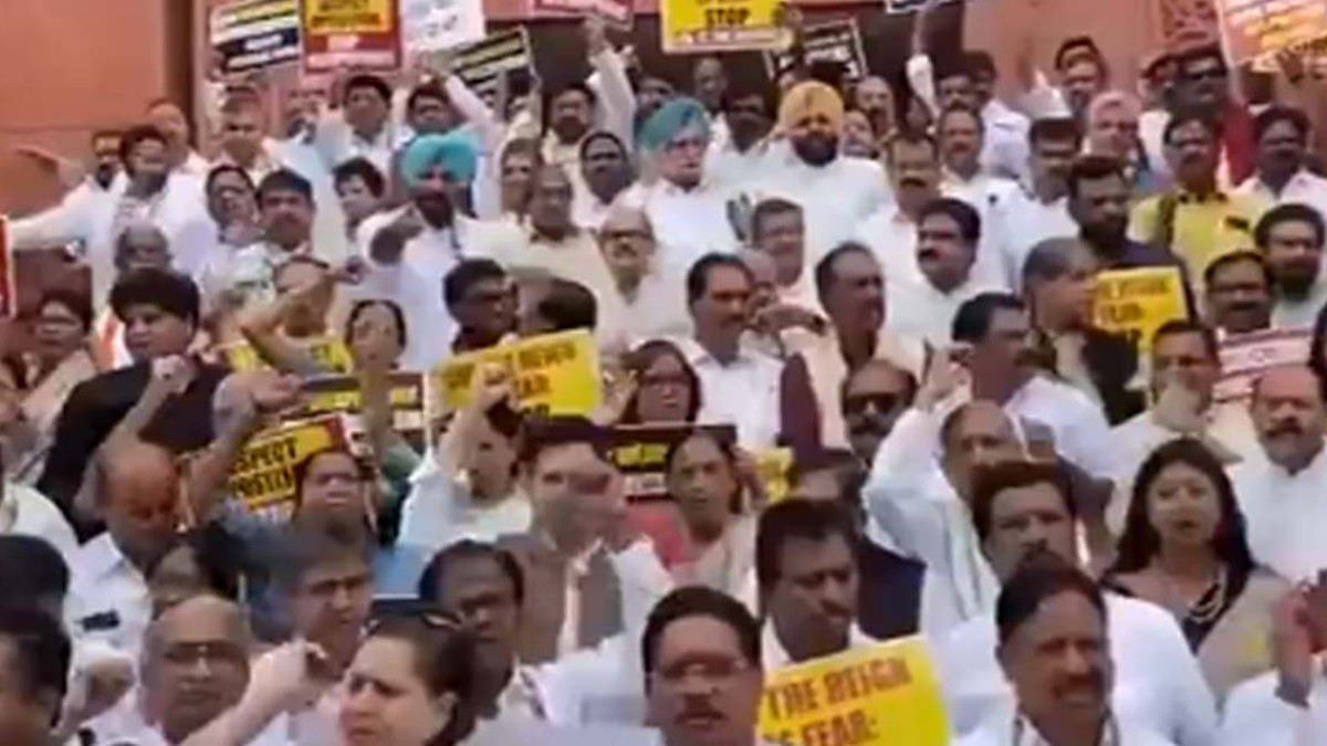 संसद भवन के गेट पर विपक्ष का प्रदर्शन: 'ED और CBI बंद करो,बंद करो'...जांच एजेंसियों के गलत इस्तेमाल के खिलाफ नेताओं ने लगाए नारे