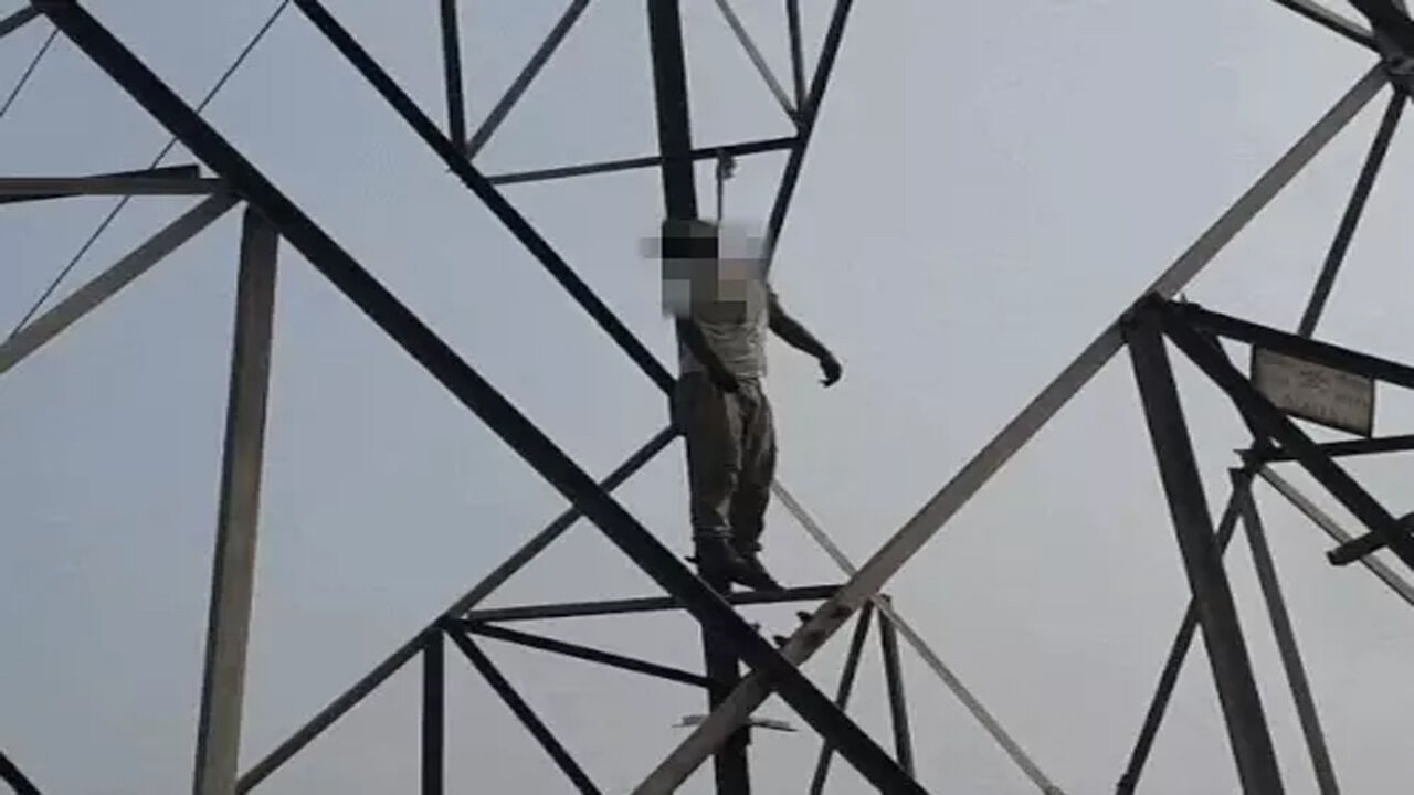 पानीपत में बिजली के टॉवर पर लगाए फंदे पर लटकता युवक का शव।