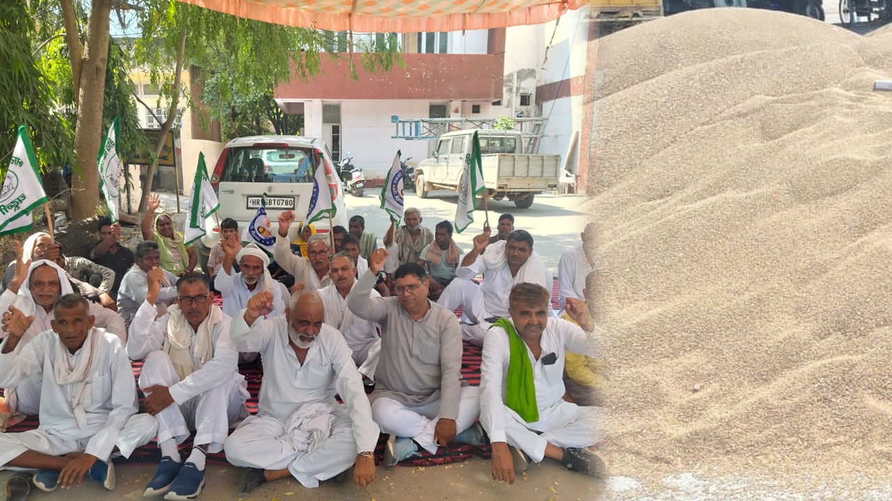 भिवानी में बाजरा खरीद न होने पर विरोध जताते किसान व मंडी में लगे बाजरे के ढेर।