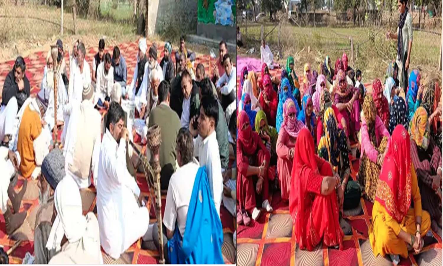 भिवानी के गांव ढाणी लक्ष्मण में रविवार को सांकेतिक धरने पर बैठे लोग।