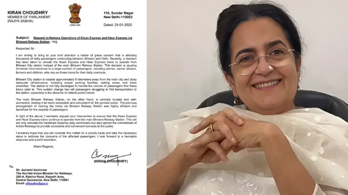 Haryana News: हरियाणा की बीजेपी नेता और राज्यसभा सांसद किरण चौधरी ने रेल मंत्री अश्विनी वैष्णव को पत्र लिखा है। इसमें उन्होंने किसान एक्सप्रेस और हिसार एक्सप्रेस का संचालन भिवानी रेलवे स्टेशन तक करने का अनुरोध किया है। लोगों की समस्याओं को सुनने के बाद उन्होंने पत्र लिखकर इसकी मांग की है। बता दें कि कुछ समय पहले फैसला किया गया था कि किसान एक्सप्रेस और हिसार एक्सप्रेस ट्रेनों को मुख्य भिवानी रेलवे स्टेशन के बजाय भिवानी सिटी स्टेशन से संचालन किया जाएगा।