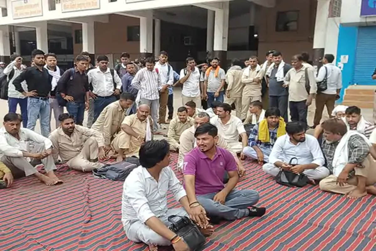 बल्लभगढ़ बस डिपो के अंदर धरने पर बैठे रोडवेज कर्मचारी।