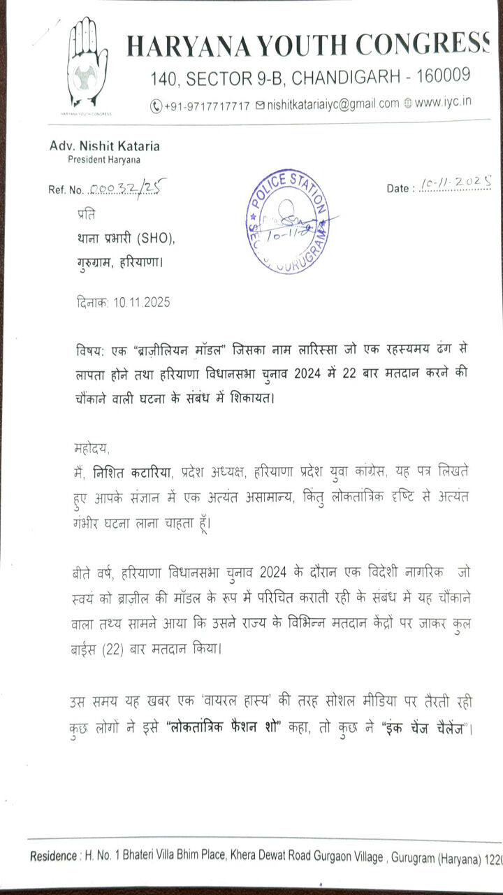 हरियाणा विधानसभा चुनावों में ब्राजीलियन मॉडल के फोटो से बनी 22 वोटों का मामला अभी थमने का नाम नहीं ले रहा है। इस मामले को लेकर हरियाणा युवा कांग्रेस ने गुरुग्राम के सेक्टर 5 थाना में शिकायत देकर जांच करने तथा कानूनी कार्रवाई की मांग की है। युवा कांग्रेस के प्रदेशाध्यक्ष निशित कटारिया ने कहा कि ब्राज़ीलियन मॉडल के फोटो से 22 वोट बनी हुई हैं। जिसने चुनावों में 22 अलग-अलग जगह मतदान भी किया था वह मॉडल अब लातपा है। उसने किन दस्तावेजों पर मतदान किया यह जांच का विषय है। यह घटना न केवल लोकतंत्र की पारदर्शिता पर प्रश्न उठाती है, बल्कि चुनावी तंत्र की विश्वसनीयता पर भी गहरी चोट करती है। शिकायत में आरोप लगाया है कि विदेशी महिला का फोटो लगातार वोटर लिस्ट में अलग-अलग बूथों पर इस्तेमाल हुआ और उसने हर बार अलग पहचान के साथ वोट डाला। सवाल यह उठता है कि आखिर कौन से दस्तावेजों के आधार पर उसकी वोटर आईडी बनी और बिना नागरिकता कैसे किया मतदान।