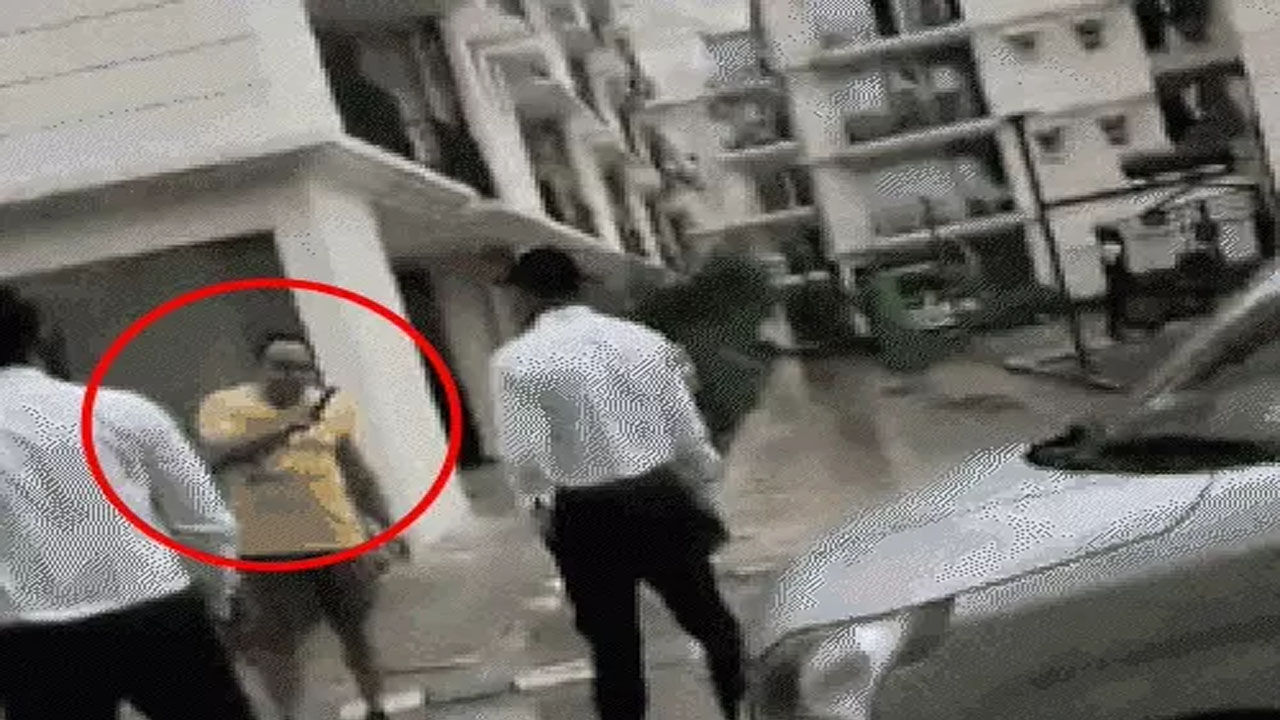 वायरल हो रहे 1.52 मिनट के इस वीडियो में सोसाइटी के मुख्य गेट पर गाड़ियों की आवाजाही दिख रही है। इसी दौरान एक पीली टी-शर्ट और ब्राउन शॉर्ट्स पहने हुआ एक व्यक्ति दो सिक्योरिटी गार्डों से उलझ रहा है। वीडियो में साफ दिख रहा है कि वह व्यक्ति हाथ में पिस्टल लिए हुए है और गार्डों को धमका रहा है।