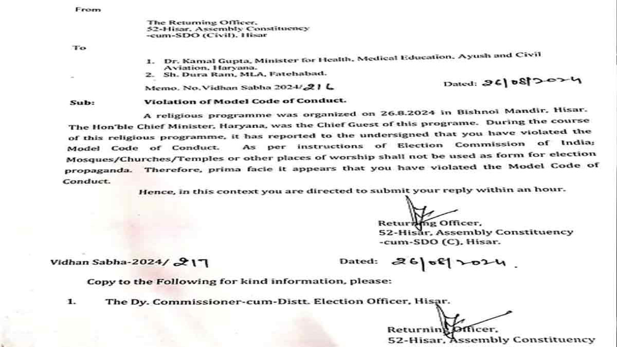 हिसार में जन्माष्टमी पर्व कार्यक्रम में वोटों की अपील करनाे पर रिटर्निंग अधिकारी ने स्वास्थ्य मंत्री डॉ. कमल गुप्ता व विधायक दुड़ाराम को नोटिस जारी कर जवाब मांगा।