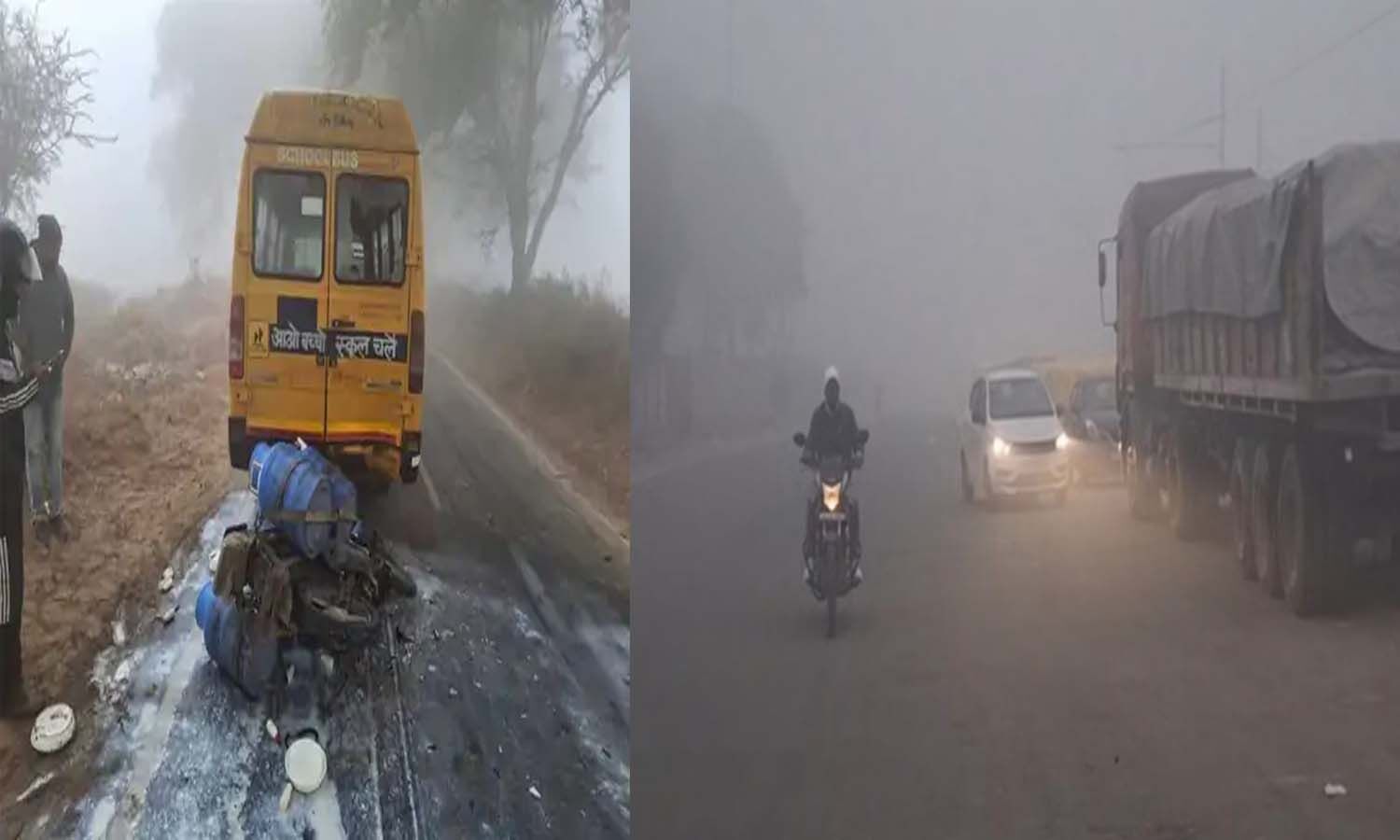 धुंध में सिरसा में दूध के कैन लेकर जा रही बाइक स्कूल वैन से टकरा गई व सोनीपत में रोहतक रोड पर सुबह छाया कोहरा।