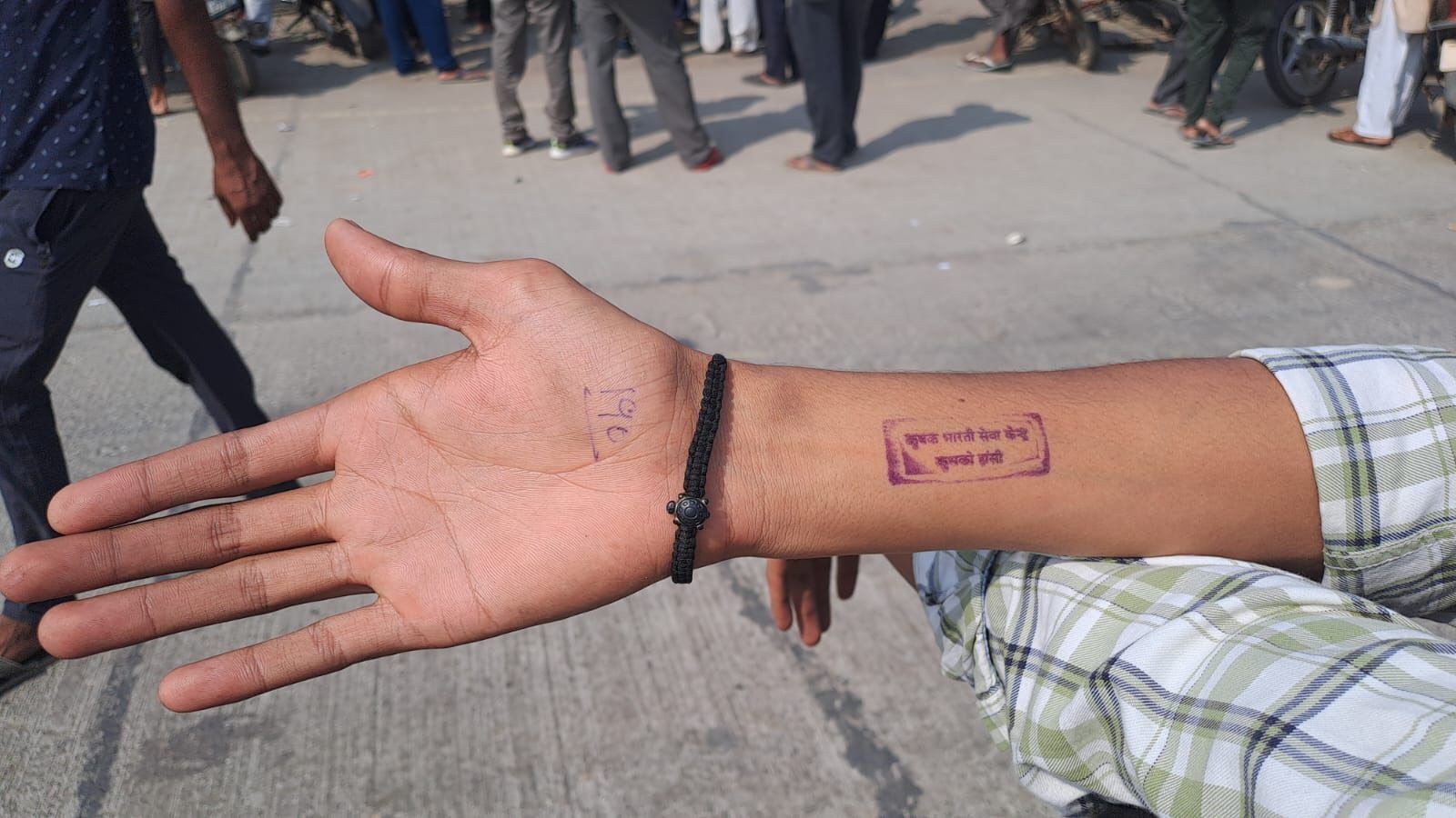 किसान सेवा केंद्र में डीएपी देने के लिए हाथ पर लगी मोहर दिखाता किसान।