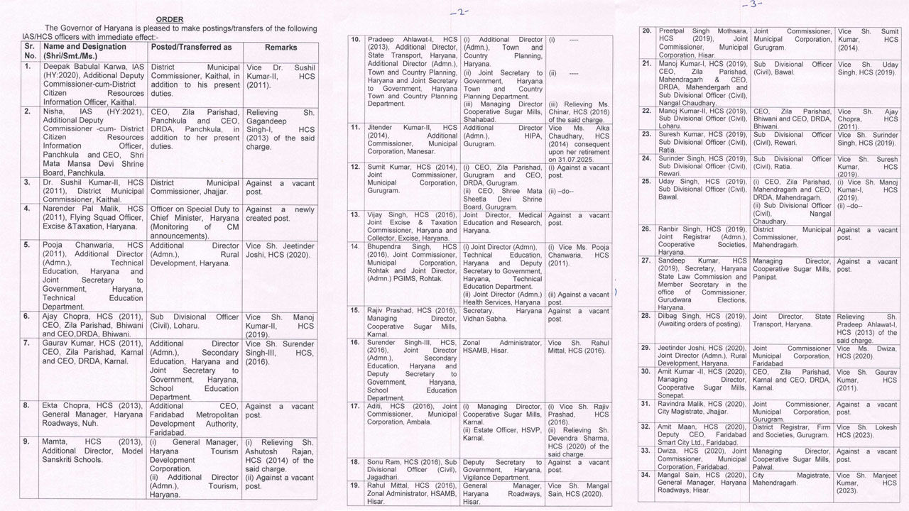 करनाल जिला परिषद व DRDA के CEO गौरव कुमार (HCS) को अब सेकेंडरी एजुकेशन के एडिशन डायरेक्टर (Admn.) और हरियाणा स्कूल एजुकेशन डिपार्टमेंट के ज्वाइंट सेक्रेटरी की जिम्मेदारी दी गई है। हरियाणा रोडवेज नूंह में जनरल मैनेजर HCS एकता चोपड़ा को अब एडिशन सीईओ, फरीदाबाद मेट्रोपॉलिटन डेवलपमेंट अथॉरिटी बनाया गया है। रेवाड़ी में सुरेश कुमार (HCS 2019) को नया एसडीएम (Sub Divisional Officer - Civil) नियुक्त किया गया है, जो पहले रतिया में यह पद संभाल रहे थे। वहीं रेवाड़ी में कार्यरत सुरेन्द्र सिंह को अब रतिया का एसडीएम बनाया गया है। मनोज कुमार-I (HCS 2019) को एसडीएम बावल बनाया गया है। वे इससे पहले महेन्द्रगढ़ में सीईओ जिला परिषद व नांगल चौधरी के एसडीएम के तौर पर कार्यरत थे। उदय सिंह (HCS 2019) को महेंद्रगढ़ का सीईओ जिला परिषद और एसडीएम नांगल चौधरी नियुक्त किया गया है। विष्णुनाथ (HCS 2023) को एसडीएम जगाधरी नियुक्त किया गया है, जबकि यहां कार्यरत सोनू राम (HCS 2016) को हरियाणा सरकार के सतर्कता विभाग (Vigilance Department) में डिप्टी सेक्रेटरी बनाया गया है।