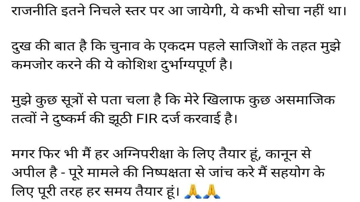 विधायक ने अपने मैसेज में बताया कि चुनाव के एकदम पहले साजिशों के तहत मुझे कमजोर करने की दुर्भाग्यपूर्ण कोशिश है। मुझे सूत्रों से पता चला कि मेरे खिलाफ कुछ असामाजिक तत्वों ने दुष्कर्म की झूठी एफआईआर दर्ज कराई है। मगर फिर भी मैं हर अग्रिपरीक्षा के लिए तैयार हूं। कानून से अपील है कि पूरे मामले की निष्पक्षता से जांच करे, मैं सहयोग के लिए पूरी तरह तैयार हूं। बिना पुष्टि के वायरल मैसेज मामले को लेकर रहस्य बना रहा। अब देखना यह कि इस मामले में पुलिस क्या कार्रवाई करेगी।