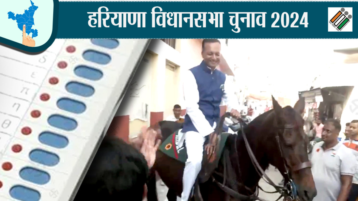 Assembly Election 2024: कुरुक्षेत्र से बीजेपी सांसद नवीन जिंदल घोड़े पर सवार होकर मतदान देने पहुंचे और यहां पर उनके समर्थकों ने उनका स्वागत किया।