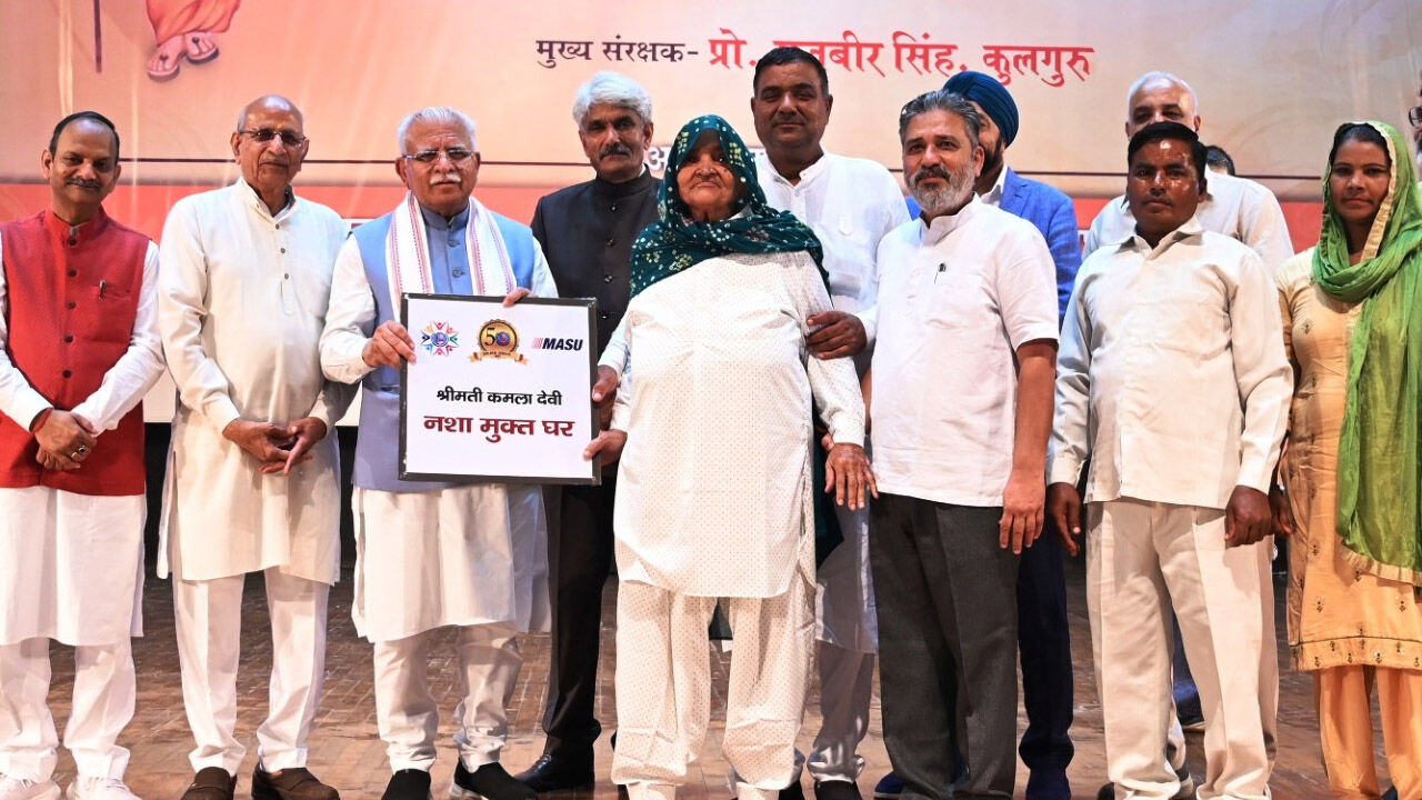 केंद्रीय मंत्री मनोहर लाल ने एमडीयू के गोद लिए गांवों के नशा मुक्त घरों के मुखिया को सम्मानित किया और ‘नशा मुक्त घर’ की नेम प्लेट भेंट की। सम्मान पाने वालों में भाली आनंदपुर के जय भगवान, टिटौली के नरेश कुमार व कमला देवी, लाहली के सुरेश व जितेन्द्र, बनियानी के सोहन व विजय कुमार, माड़ौदी के सोमबीर व अनिल शामिल रहे। अब इन परिवारों में कोई भी नशा नहीं करता।
