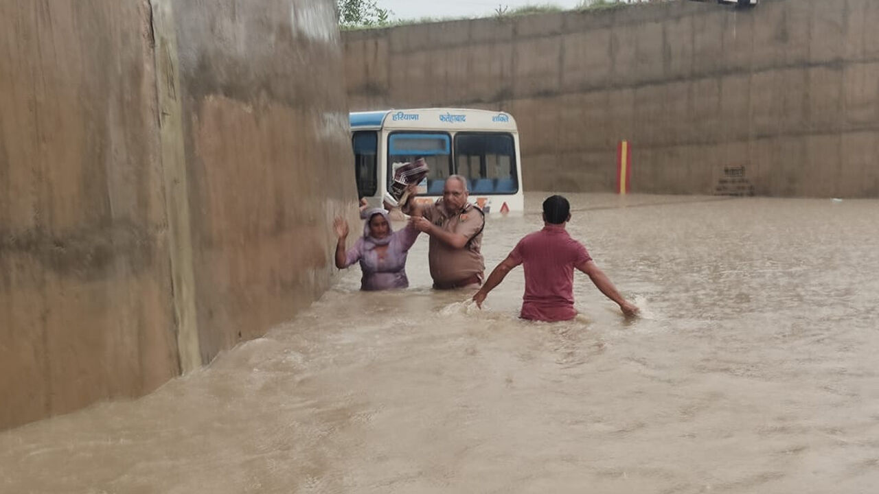 फतेहाबाद में रोडवेज बस के पानी में फंसने के बाद सवारियों को बचाते पुलिस कर्मचारी।