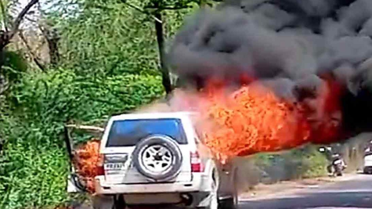 सड़क पर चलती कार बनी आग का गोला: लग्जरी कार में लगी आग, धूं-धूं कर जल उठी लपटे, छलांग लगाकर चालक ने बचाई जान
