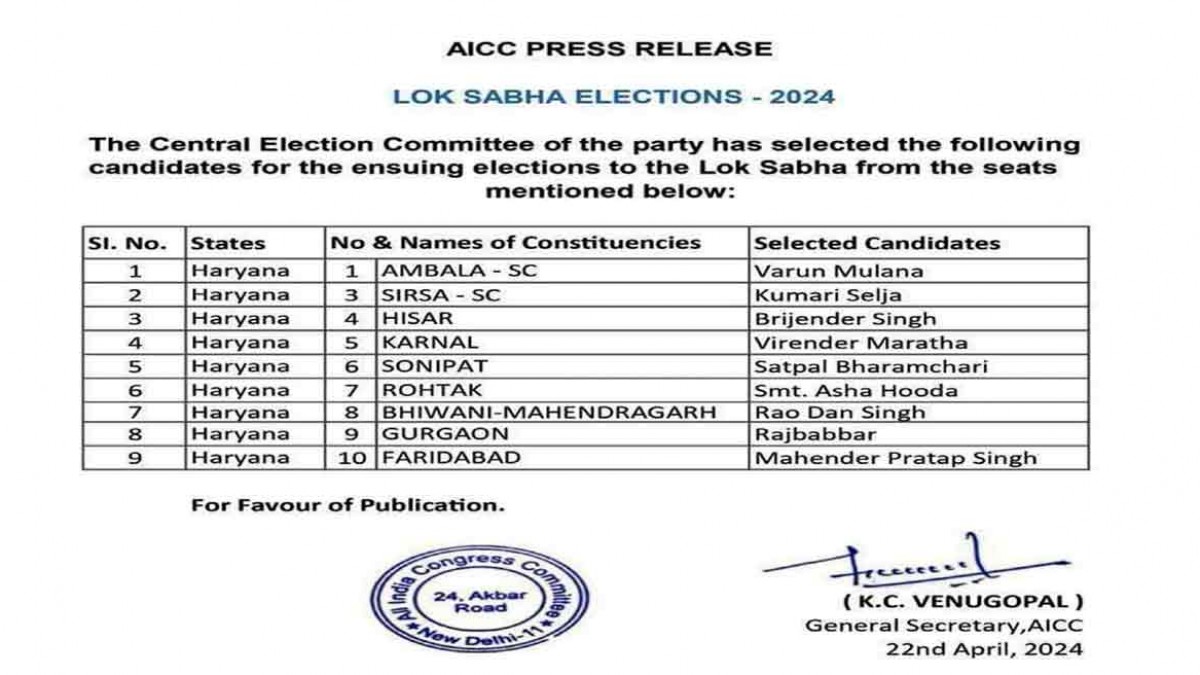 जानकारी अनुसार सोमवार सुबह सोशल मीडिया पर एक पत्र वायरल हुआ। उस पर सबसे ऊपर एआईसीसी प्रेस रिलीज लिखा था। नीचे लोकसभा चुनाव-2024 था। उसके बाद लिखा था कि केंद्रीय चुनाव समिति ने आगामी लोकसभा चुनाव के लिए नौ उम्मीदवारों का चयन किया है। इनमें रिजर्व सीट अंबाला से वरूण मुलाना व सिरसा से कुमारी सैलजा का नाम था। उसके बाद हिसार लोकसभा से बृजेंद्र सिंह, करनाल से वीरेंद्र मराठा, सोनीपत से सतपाल ब्रह्मचारी, रोहतक से आशा हुड्डा, भिवानी-महेंद्रगढ़ लोकसभा से राव दानसिंह, गुरुग्राम से राजबब्बर और फरीदाबाद लोकसभा सीट से महेंद्र प्रताप सिंह का नाम लिखा है। हैरानी की बात है कि लेटर के अंत में एआईसीसी के महासचिव केसी विष्णुगोपाल का नाम प्रिंट के ऊपर नीली श्याही में हस्ताक्षर भी है।
