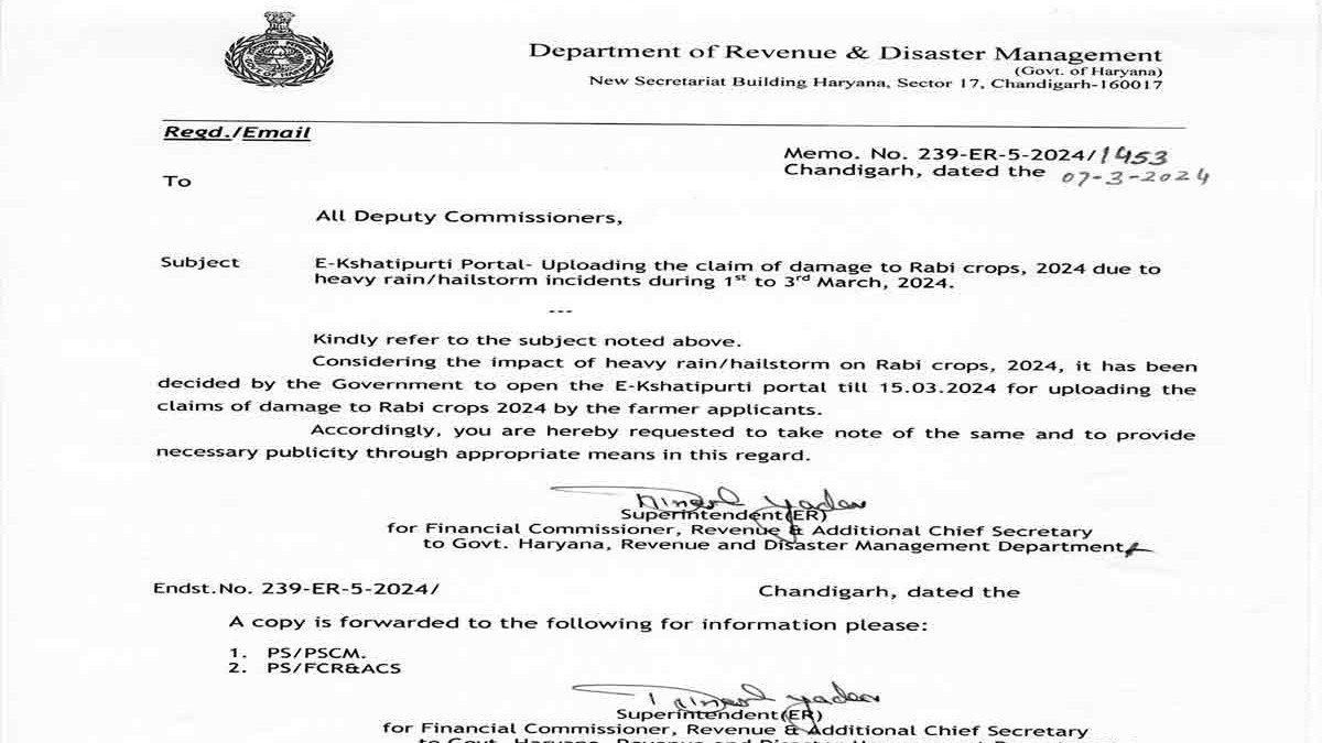 राजस्व एवं आपदा प्रबंधन विभाग ने सभी जिला उपायुक्तों को पत्र भेजकर कहा कि बरसात व ओलावृष्टि से नष्ट हुई फसल के लिए क्षतिपूर्ति पोर्टल पर किसानों के आवेदन लिए जाएं।