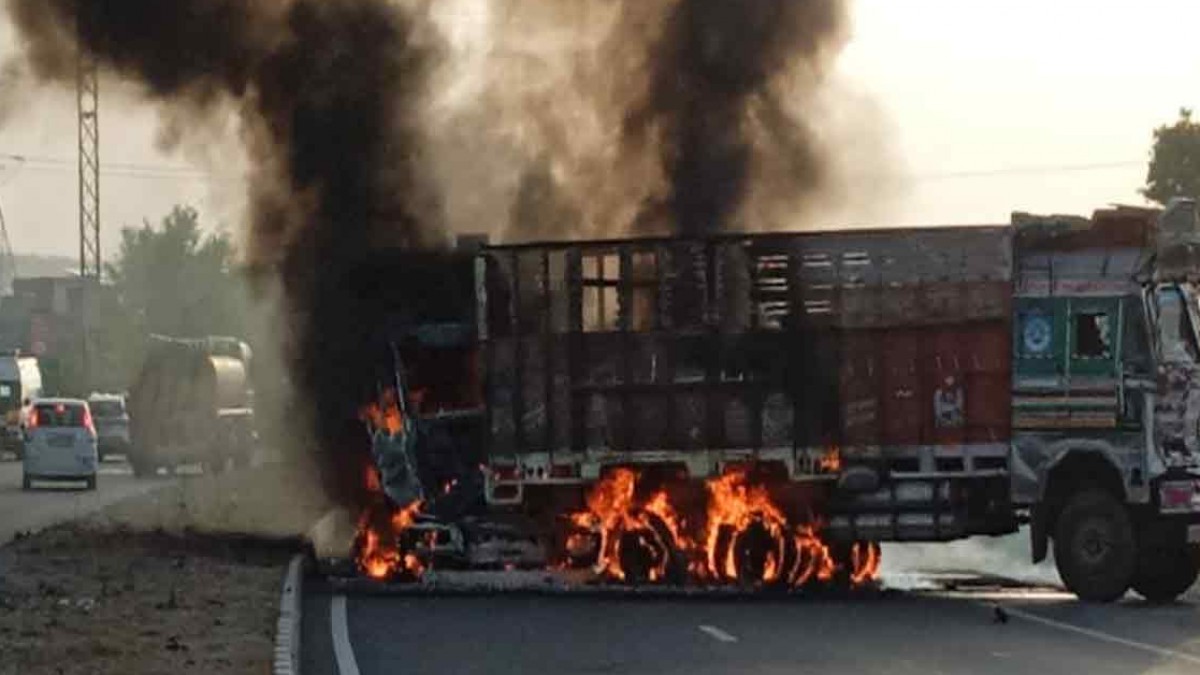 रेवाड़ी में ट्रक व ट्राले की भीषण टक्कर: सड़क हादसे के दौरान ट्राले में लगी आग, झुलसने से चालक की मौत