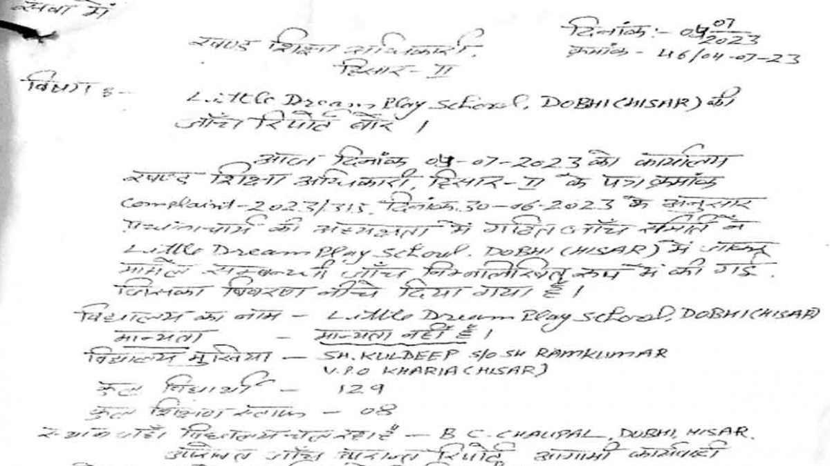 ग्राम पंचायत की शिकायत मिलने के बाद खंड शिक्षा अधिकारी ने जांच के लिए राजकीय वरिष्ठ माध्यमिक विद्यालय डोभी के प्राचार्य को जांच के लिए लिखा। खंड शिक्षा कार्यालय ने 30 जून 2023 को जांच के निर्देश देते हुए प्राचार्य को कहा कि दो वरिष्ठ प्राध्यापकों को साथ लेकर जांच की जाए और रिपोर्ट तीन दिन के अंदर-अंदर उनके कार्यालय को भेजी जाए। राजकीय वरिष्ठ माध्यमिक विद्यालय डोभी के प्राचार्य पर आधारिक तीन सदस्यीय कमेटी ने शिकायत की जांच की। जांच में प्राचार्य की कमेटी ने साफ लिखा कि गांव की बीसी चौपाल में लिटल ड्रीम प्ले स्कूल चल रहा है, इसका मान्यता नहीं है और संचालक खारिया निवासी कुलदीप है।