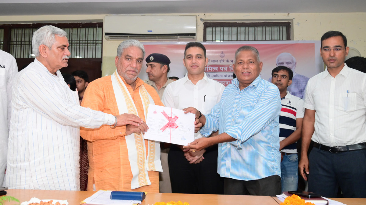 कृष्ण लाल पंवार ने शहरी क्षेत्र में लाल डोरे के भू-मालिकों को मालिकाना हक व मुख्यमंत्री शहरी स्वामित्व योजना के तहत स्वामित्व पत्र व रजिस्ट्री सौंपी।