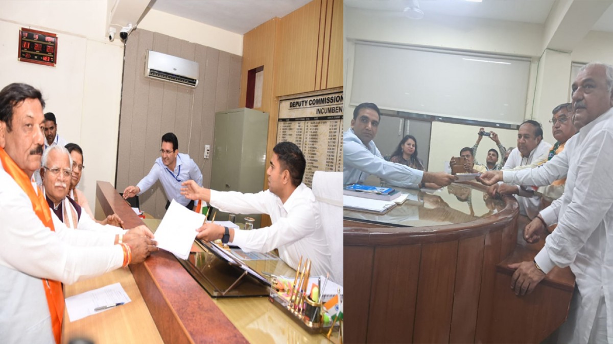 हिसार से मनोहर लाल व सावित्री जिंदल के साथ भाजपा उम्मीदवार रणजीत चौटाला और सोनीपत से भूपेंद्र सिंह हुड्डा व उदयभान की मौजूदगी में कांग्रेस के सतपाल महाराज ने भरा पर्चा।