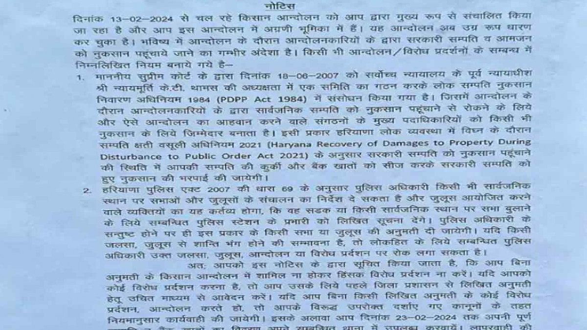 दिल्ली कूच को लेकर कई किसान संगठन शंभू बॉर्डर पर पिछले 11 दिनों से डटे हुए हैं। इनमें कई संगठन हरियाणा से जुड़े हैं। इन संगठनों से जुड़े नेता व किसान लगातार एमएसपी गारंटी कानून समेत कई मांगों को लेकर केंद्र सरकार के खिलाफ प्रदर्शन कर रहे हैं। किसानों की ओर से दिल्ली कूच को लेकर शंभू बॉर्डर पर पुलिस की ओर से लगाए गए बैरिकेट्स को तोड़ने के प्रयास किए जा रहे हैं। पुलिस की माने तो इस दौरान सरकारी व प्राइवेट संपत्ति को काफी नुकसान पहुंचाया जा चुका है। इस नुकसान का अभी आंकलन किया जा रहा है। पुलिस की ओर से किसान नेताओं के घरों के बाहर चस्पाएं गए पोस्टरों में कहा गया कि सरकारी व प्राइवेट संपत्ति को पहुंचाए जा रहे नुकसान की भरपाई उनकी संपत्ति व बैंक खातों को सीज करके की जाएगी।