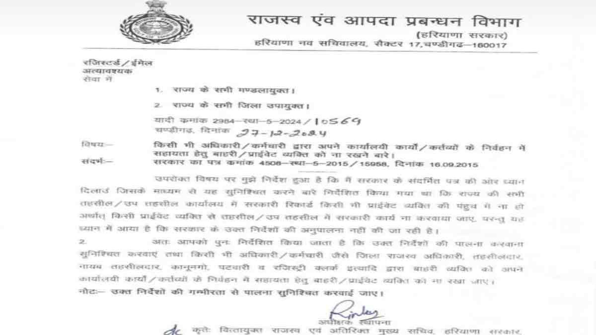 प्रदेश भर के सभी मंडल आयुक्तों, जिला उपायुक्तों को निर्देश जारी किए गए कि कोई भी अधिकारी अपने कार्यालय के कार्यों को लेकर सहायता के लिए बाहरी निजी व्यक्ति को नहीं रख सकता। इस बारे में पहले भी पत्र जारी करते हुए अतिरिक्त मुख्य सचिव हरियाणा सरकार (Haryana Government) वित्त आयुक्त एवं राजस्व ने कहा कि सरकार के सभी तहसीलों, उप तहसील कार्यालयों में सरकारी रिकॉर्ड किसी भी निजी व्यक्ति की पहुंच में नहीं होना चाहिए। किसी भी निजी व्यक्ति से तहसील, उप तहसील में सरकारी कार्य नहीं कराया जाए।