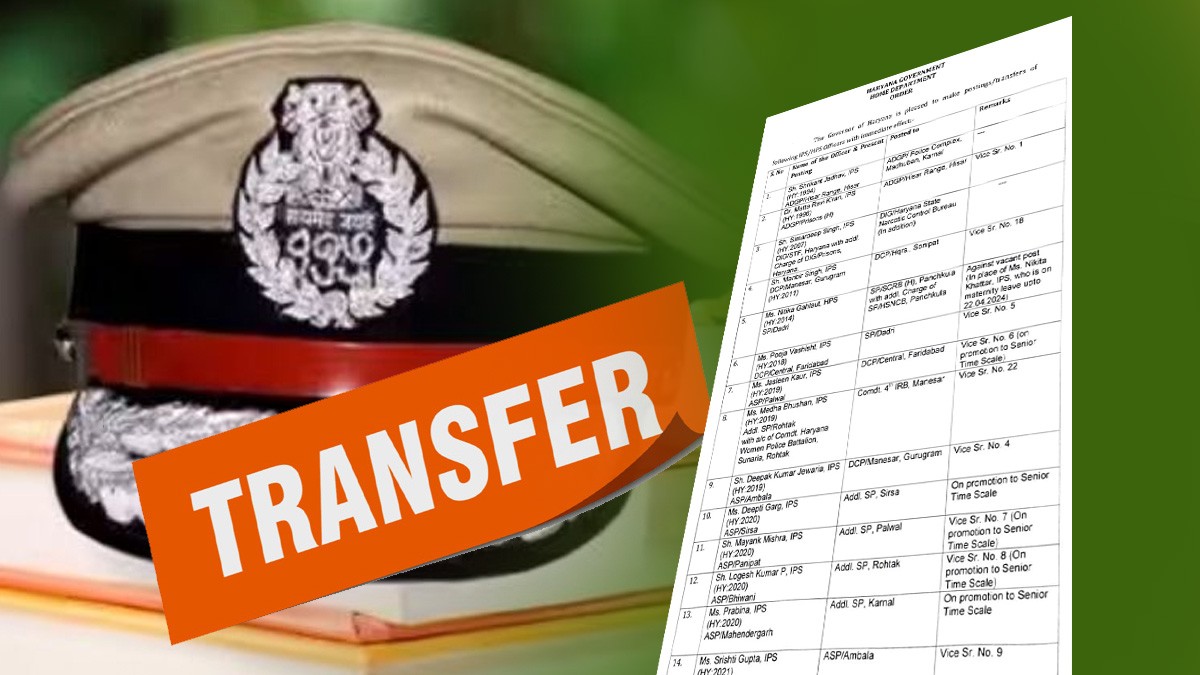Haryana IPS Transfer List: हरियाणा पुलिस प्रशासन में बड़ा फेरबदल, 15 IPS अफसर समेत 71 पुलिस अधिकारियों का ट्रांसफर