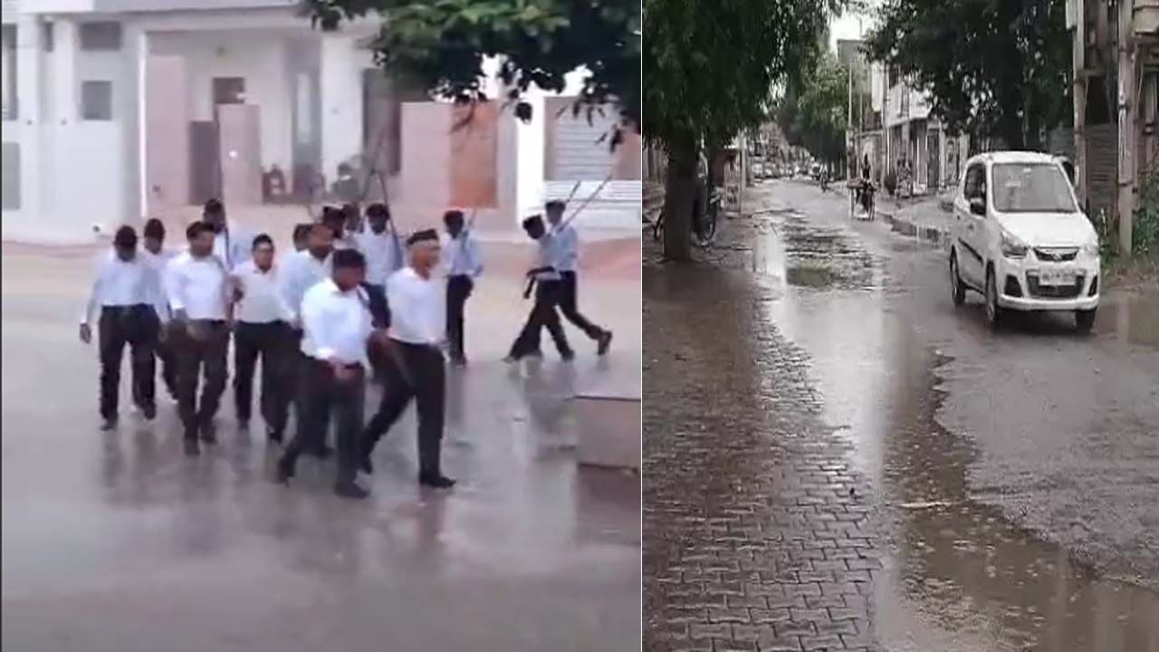 सिरसा में बारिश के बीच पथ संचलन करते आरएसएस के स्वयंसेवक और फतेहाबाद में होती बूंदाबांदी।